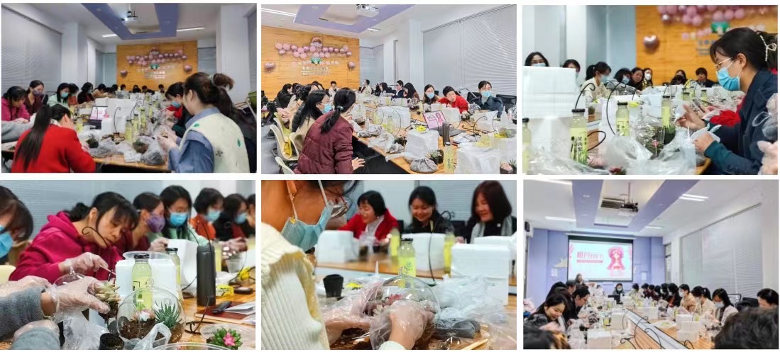 活动当天,30余位教职工围坐在盆景制作区,热闹非凡。大家先对盆景理论知识进行了学习,包括盆景植物的特点,多肉植物的基本分类,盆景植物的养护与管理等,在短暂的学习了解之后便进入了本次活动的实践环节。填土、配色、种植......大家不断发挥创造力,整合造型,动手栽种自己的作品。经老师们的巧手修整后,一盆盆错落有致,各具风采的多肉盆景顺利完工。