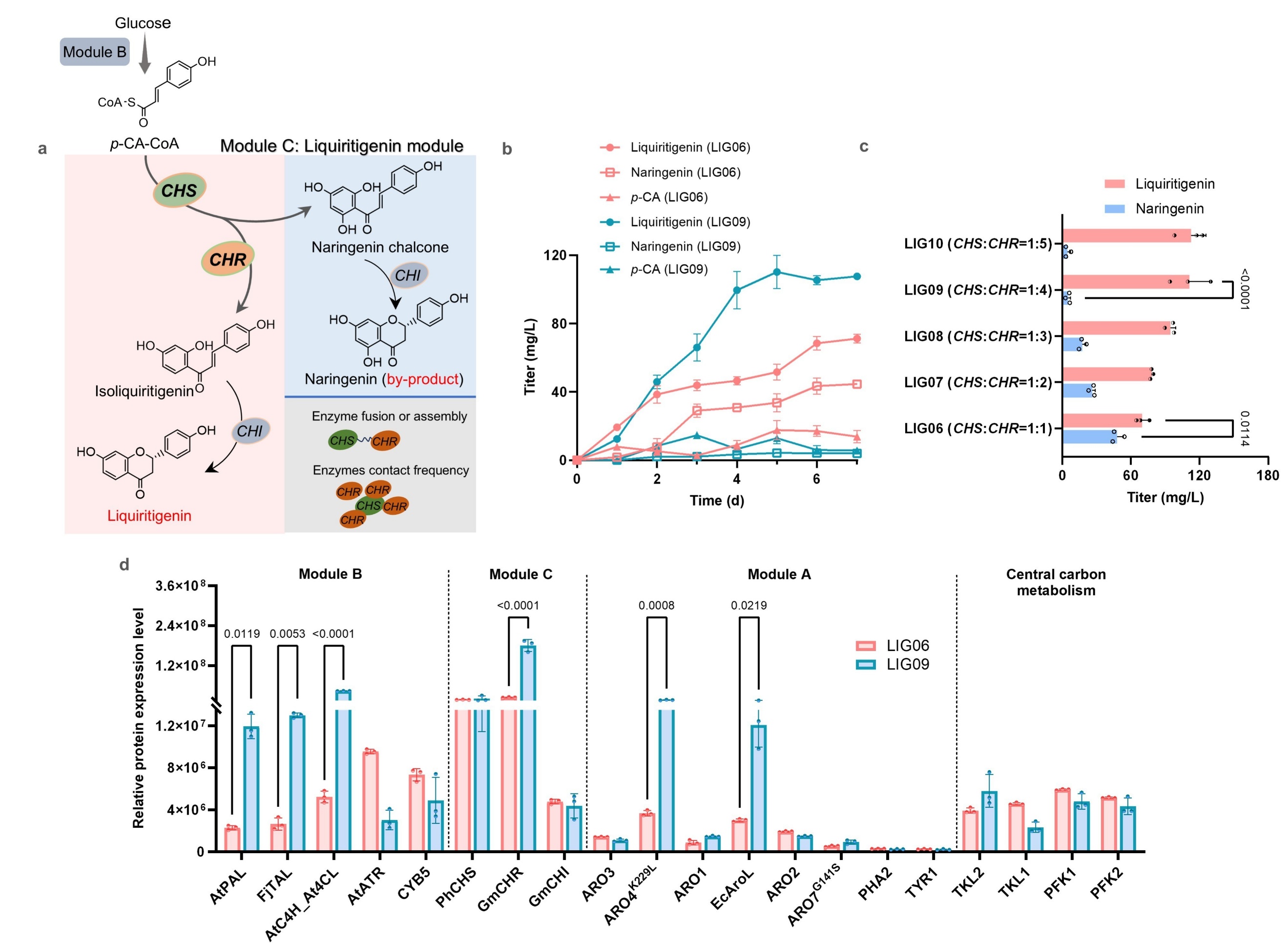 首先在酿酒酵母中重构甘草素的异源合成途径,通过模块化设计、优化关键酶表达及强化芳香族氨基酸前体供应,逐步提高了甘草素产量。针对合成过程中副产物柚皮素大量积累的问题,通过精确调控CHS与CHR的基因拷贝比例,提高CHR丰度以增强其与中间体的接触频率,将柚皮素占比降至总产物5%以下。CHR蛋白表达水平的提高还协同上调了上游多种酶的蛋白表达,从而全面强化了整个合成通路,最终将甘草素产量提升至111.3 mg/L。