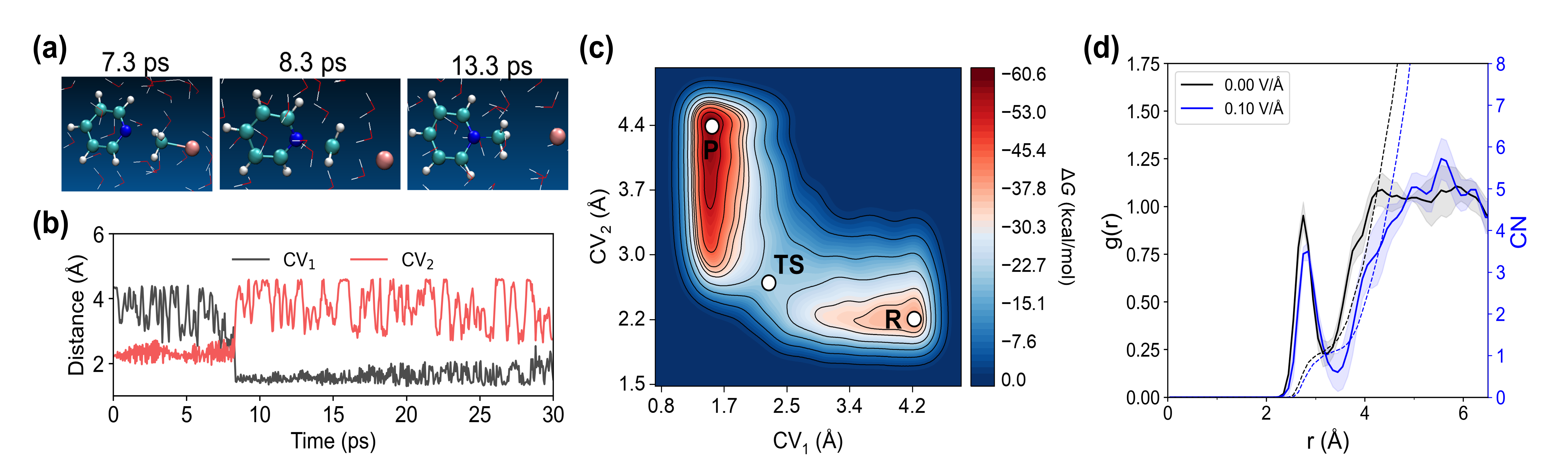 图2. 从头算分子动力学模拟门舒特金反应。(a) 轨迹代表性快照。 (b) 集合变量随时间变化曲线。 (c) 门舒特金反应自由势能面。 (d) 亲核位点周围水分子在有/无电场下的径向分布。
