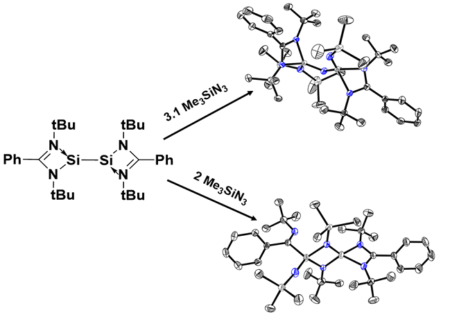 首次报道了用稳定的氮卡宾试剂作为氮源来合成含氮化合物R1LSi-N←SiLR2 (1) [L= PhC(NtBu)2; R1= NTMS2, R2= NTMS]。化合物1是通过LSi(I)-Si(I)L与3.1当量的Me3SiN3在低温下反应得到类似三烯的结构骨架而合成的。而LSi(I)-Si(I)L与2.1当量的Me3SiN3在室温下反应生成了带有中心四元Si2N2环的硅胺,该环伴随着一个亚甲硅烷LSi和一个裂解的亚甲硅烷片段。化合物1在室温下进一步与AgOTf反应生成有机银配合物,该化合物显示氮卡宾与银与三氟甲磺酸盐的配位。通过NMR、质谱和X-射线晶体衍射对合成的新化合物进行了充分表征。量子力学计算表明,化合物1具有双配位的单价N原子,N原子的孤对单子通过超共轭相互作用稳定。以上研究提出了硅卡宾、氮卡宾新的反应类型与反应机制,对于理解卡宾类似物的反应体系和活化机理有着重要的意义。