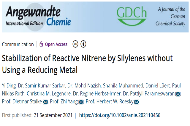 近日,北京理工大学化学与化工学院杨智教授与合作者在氮卡宾领域取得重要进展。相关成果以“Stabilization of Reactive Nitrene by Silylenes without using a Reducing Metal”为题,在国际化学顶级期刊《Angewandte Chemie International Edition》发表,被期刊列为Hot Paper。论文链接:https://onlinelibrary.wiley.com/doi/10.1002/anie.202110456。北京理工大学化学与化工学院博士丁毅为第一作者,北京理工大学杨智教授、哥廷根大学Herbert W. Roesky教授、哥廷根大学Dietmar Stalke教授和卡利卡特国立理工学院Pattiyil Parameswaran博士为共同通讯作者。
