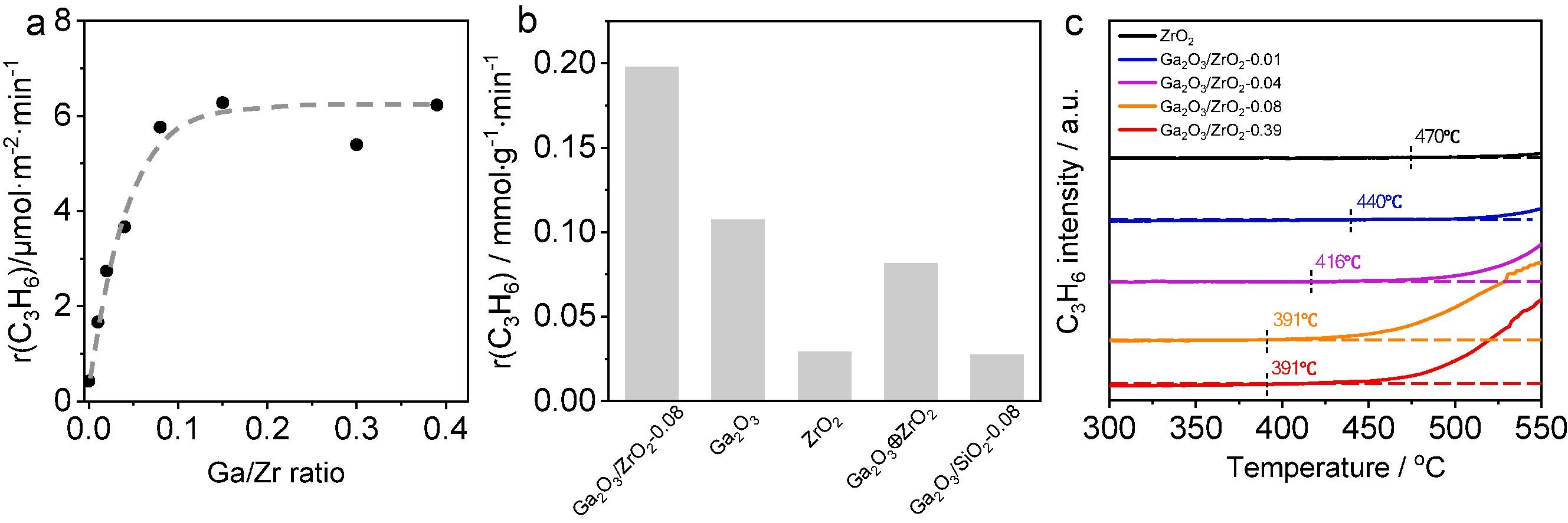 图4 (a) Ga2O3/ZrO2催化剂的丙烯生成速率与Ga/Zr比的关系,(b)不同Ga2O3基催化剂活性对比,(c)C3H8-TPSR测试中丙烯强度与温度的关系。