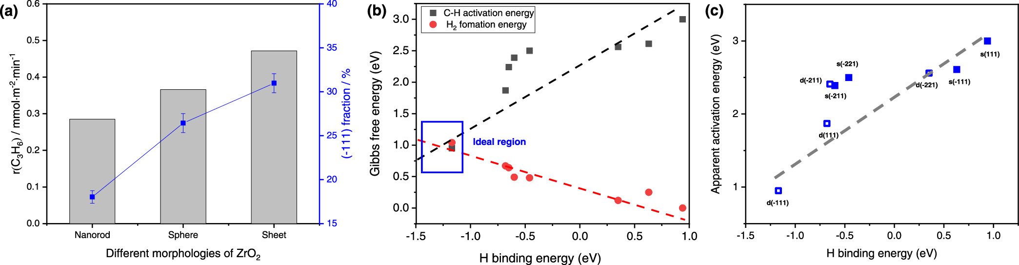 图3 (a) PDH反应中丙烯的生成速率(r(C3H6))(灰色柱状)和不同形貌ZrO2的(-111)晶面比例(蓝色方框)。(b) Gibbs自由能垒与H原子结合能的关系图,黑色为C−H键断裂能垒,红色为H2生成能垒。(c) 不同晶面ZrO2的表观活化能与H原子结合能的关系