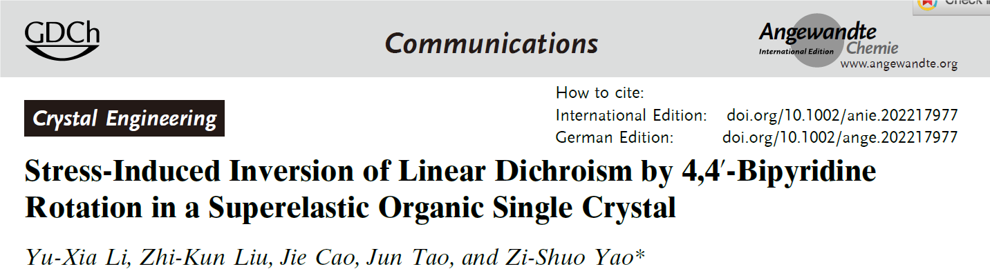 近日,北京理工大学化学与化工学院姚子硕研究员在超弹性分子基单晶材料研究中取得重要进展。相关工作以“Stress-Induced Inversion of Linear Dichroism by 4,4′-Bipyridine Rotation in a Superelastic Organic Single Crystal”为题,发表在国际著名化学期刊Angew. Chem. Int. Ed.。北京理工大学为唯一作者单位,化学与化工学院陶军教授研究团队的姚子硕研究员为文章通讯作者,文章第一作者为北京理工大学博士研究生李宇霞。