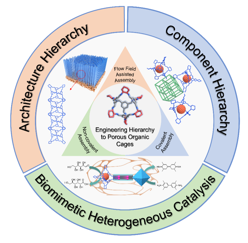 多级次结构是生物体系实现高效催化功能的核心特征,广泛存在于蛋白质、核酸等生物大分子中,并赋予其精确调控复杂化学反应网络的能力。典型代表如酶,其通过多级组装形成的活性微环境可在温和条件下高效催化多步代谢反应,展现出极高的选择性和底物适应性。受此启发,近年来,人工仿生催化体系的设计与构建取得了重要突破。其中,多孔有机分子笼(Porous Organic Cages,POCs)因其可精确调控的笼状空腔结构和明确的分子识别位点,成为模拟酶限域催化微环境的理想平台。研究表明,分子笼不仅能通过纳米限域效应增强底物富集与活化,还可通过精准调控活性中心的微环境和空间排布,实现对反应路径的选择性控制。然而,现有多孔有机分子笼材料大多局限于单一尺度的固有孔道结构,缺乏类似生物酶的多级次组装特征,导致其在复杂催化体系中的应用受到限制。因此,如何通过多级结构工程策略优化分子笼催化剂的性能,已成为该领域亟待解决的关键科学问题。