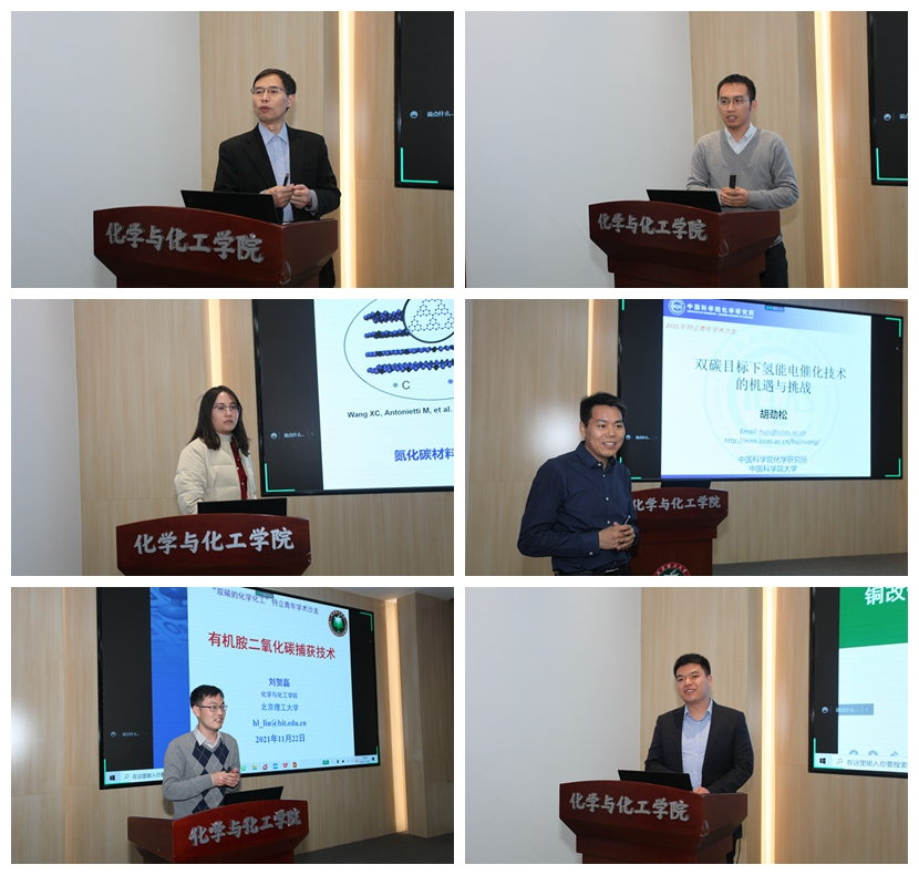 清华大学朱永法教授作了题为《光电催化太阳能转化研究》的报告,介绍了光催化产氢、产氧和CO2 还原等方面的最新研究成果;化学与化工学院冯霄教授作了题为《面相分离应用的多孔材料及其薄膜的构筑》的报告,讨论了多孔材料分离膜在CO2减排等方面应用前景;化学与化工学院韩庆副研究员以《氮碳共轭材料光催化》为题,分享了调控和设计高性能光催化材料等方面的研究;中科院化学所胡劲松教授作了题为《“双碳”目标下氢能电催化技术的机遇与挑战》的报告,探讨了氢能电催化技术目前仍存在的问题和未来可能的发展方向;化学与化工学院刘贺磊教授作了《有机胺二氧化碳捕获技术》的报告,分享了有机胺二氧化碳捕获技术的前沿进展;化学与化工学院任戎征博士作了《固体氧化物电池钙钛矿电极结构调控及高温电催化性能》的报告,分享了电极结构调控策略在高温电催化中的应用。