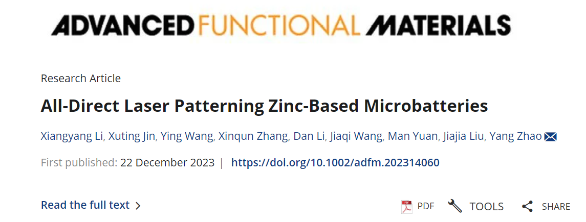 近日,北京理工大学化学与化工学院博士生李向阳第一作者身份在国际顶级期刊《Advanced Functional Materials》发表题目为“All-Direct Laser Patterning Zinc-Based Microbatteries”的研究论文(DOI:10.1002/adfm.202314060)。北京理工大学为论文第一通讯单位,北京理工大学化学与化工学院赵扬特别研究员为通讯作者。