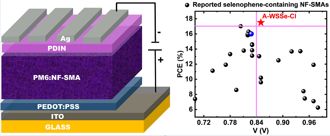 图2:聚合物太阳能电池的器件结构(左图);基于单个硒吩环的非对称结构A-WSSe-Cl与其他已报道硒吩类的受体材料的光伏器件结果对比统计图(右图)。