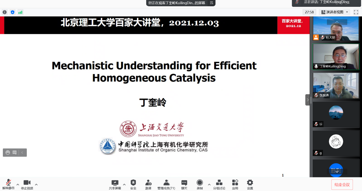 2021年12月3日上午,由北京理工大学研究生院主办、化学与化工学院承办的 “百家大讲堂”系列讲座在腾讯会议室649 866 350举行。应化学与化工学院杜大明教授的邀请,上海交通大学常务副校长丁奎岭院士作了题为“高效均相催化的机理理解”的学术报告,化学与化工学院院长张加涛教授主持报告会。陈甫雪教授、杨小会教授、张小玲教授、吴彪教授、姚燎原教授等一百多名师生在线上参加了报告会并进行了学术交流。