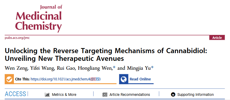 2024年8月2日,北京理工大学化学与化工学院于明加副研究员和温鸿亮副教授带领的团队在国际权威期刊Journal of Medicinal Chemistry发表了题为“Unlocking the Reverse Targeting Mechanisms of Cannabidiol: Unveiling New Therapeutic Avenues”的研究论文(DOI: 10.1021/acs.jmedchem.4c01353)。该团队在针对大麻二酚分子机制的深入研究中取得了重要进展,特别是其作为部分激动剂与GPR18靶点蛋白相互作用方面的新发现。这一成果不仅加深了我们对大麻二酚生物活性的理解,也为未来基于大麻二酚的新型药物的开发奠定了理论基础。
