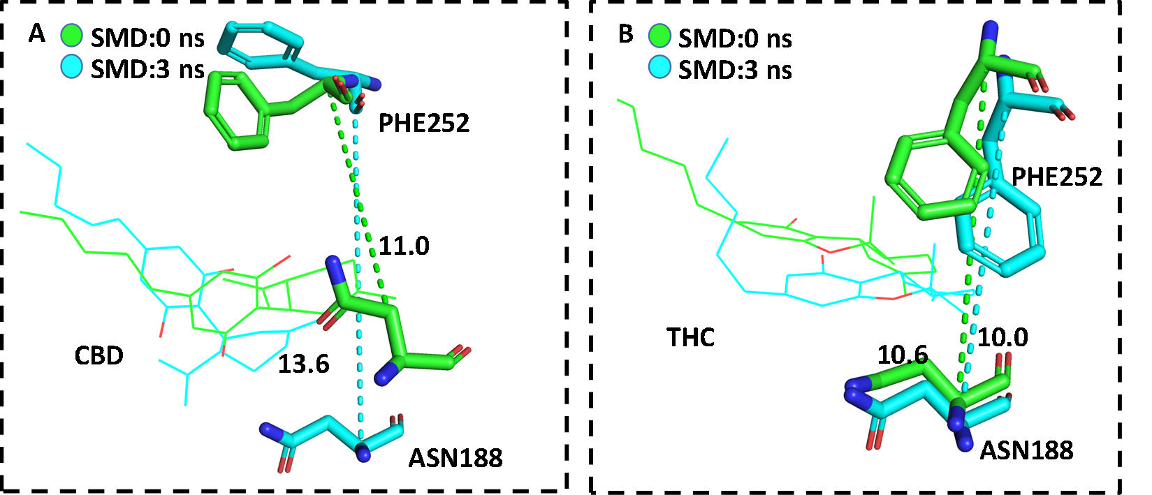 图3 GPR18-大麻二酚与GPR18-四氢大麻酚复合物在拉伸分子动力学模拟下关键结合残基Cα距离变化