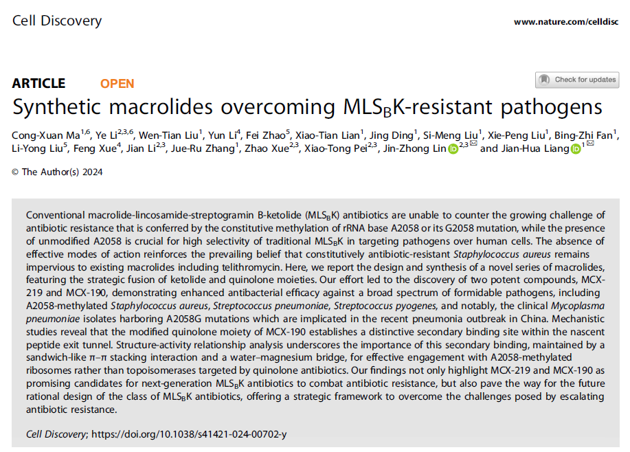 Cong-Xuan Ma#, Ye Li#, Wen-Tian Liu, Yun Li, Fei Zhao, Xiao-Tian Lian, Jing Ding, Si-Meng Liu, Xie-Peng Liu, Bing-Zhi Fan, Li-Yong Liu, Feng Xue, Jian Li, Jue-Ru Zhang, Zhao Xue, Xiao-Tong Pei, Jin-Zhong Lin*, Jian-Hua Liang* Synthetic macrolides overcoming MLSBK-resistant pathogens. Cell Discovery, 2024, 10(75)DOI: 10.1038/s41421-024-00702-y