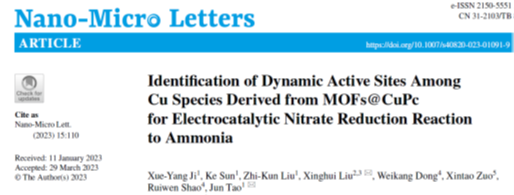 近日,北京理工大学化学与化工学院陶军教授团队在电催化硝酸根还原制氨方面取得重要进展。相关研究成果以“Identification of dynamic active sites among Cu species derived from MOFs@CuPc for electrocatalytic nitrate reduction reaction to ammonia”为题,在国际知名期刊《纳微快报》(Nano-Micro Letters)上发表(DOI:10.1007/s40820-023-01091-9)。该工作以北京理工大学为第一通讯单位,陶军教授和韩国成均馆大学的刘性辉博士为共同通讯作者,博士研究生冀学洋为该论文的第一作者。该文章也得到了北京理工大学医工融合研究院邵瑞文副研究员团队在双球差校正扫描透射电子显微镜方面的技术支持。