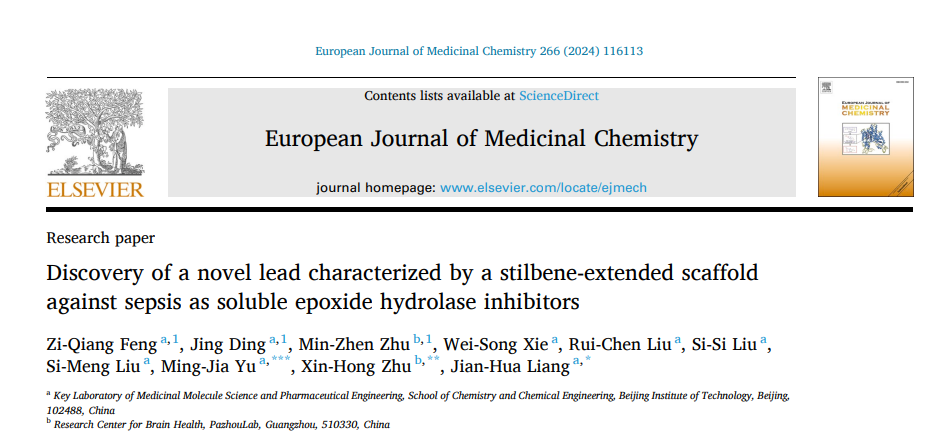 2024年1月3日,北京理工大学化学与化工学院梁建华教授课题组在抗败血症药物研究中取得重要进展,设计合成了基于天然骨架二苯乙烯类sEH抑制剂并用于治疗败血症,其中最优化合物70P (FZQ-21) 能够在小鼠体内有效抑制sEH酶水解活性并显著提高小鼠败血症模型的总生存率。相关成果发表以Discovery of a Novel Lead Characterized by a Stilbene-extended Scaffold against Sepsis as Soluble Epoxide Hydrolase Inhibitors为题发表于期刊European Journal of Medicinal Chemistry。