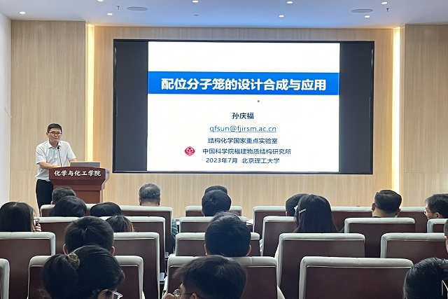 应北京理工大学化学与化工学院邀请,中科院福建物构所孙庆福研究员于2023年7月7日做客北理工“百家大讲堂”,为我院广大师生带来题为“稀土功能配合物超分子自组装”的精彩学术报告。本次报告在生态楼118报告厅进行,由姚燎原老师主持,近六十名化院师生参加了报告。