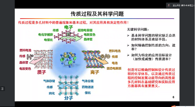 围绕传质过程中亟待解决的科学问题,例如如何精确控制传质的方向、速率,如何为特定的应用目标设计(加快或减慢)传质速率,如何设计开发合适的材料体系、拓展表征手段进一步开展研究等系列科学问题,顾成教授分享了近五年来其在柔性多孔材料及其传质过程控制方面取得了创新性的成果:1)创造出基于“翻折运动”的“局域柔性”金属-有机框架(MOF)材料来精确控制气体扩散过程,实现了极难分离的相似气体的有效拆分;2)通过基于“翻折运动”的“局域柔性”MOFs来控制和放大同位素体之间扩散速率的微小差异,首次通过吸附分离方式实现水同位素体混合物的有效分离;3)提出“电荷诱导分散”和“热致超交联”策略,将有机多孔聚合物(POPs)材料加工成高质量薄膜和凝胶,从而大幅促进传质过程并拓展应用领域。报告详细且精彩,在交流环节,在线师生也就报告内容与顾成教授进行了深入细致的探讨,交流气氛热烈,与会师生收获颇丰。