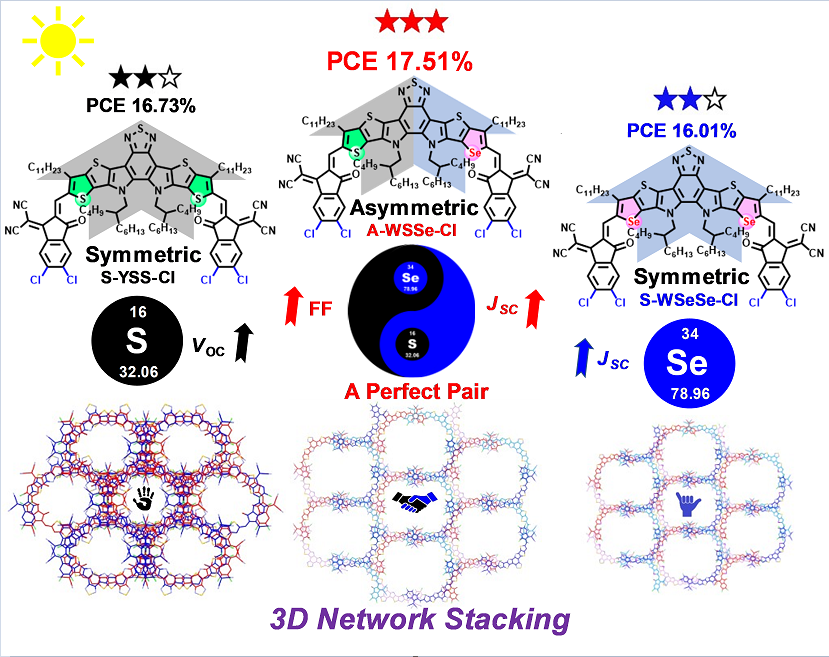 环境污染和能源危机是当今世界面临的两大难题,开发和利用高效率清洁能源是国家能源战略中亟需解决的重大科学问题。聚合物太阳能电池凭借其重量轻、机械柔性高、半透明、易于卷对卷印刷等优点,近年来在高效率清洁能源材料领域引起了广泛关注。非富勒烯小分子受体材料因能更好地吸收长波和优化的化学结构,增强了器件参数的平衡,从而显著提高了聚合物太阳能电池的光电转换效率。与噻吩类小分子受体材料相比,含有硒吩及其衍生物的受体材料经常表现出吸收光谱红移和电荷传输能力强的优点,使其在实现更高性能方面具有更多的可能性。但材料合成具有一定的挑战,此前基于高效率的硒吩类受体材料体系的研究报道相对较少。同时,如何通过解析分子化学结构、聚集形态特征(如单晶分子堆积和相分离)、理解其与宏观器件性能之间的关系,开发新型给受体材料,进而制备出高效率的聚合物太阳能电池,是目前科研人员一直关注和致力于解决的关键性科学问题。