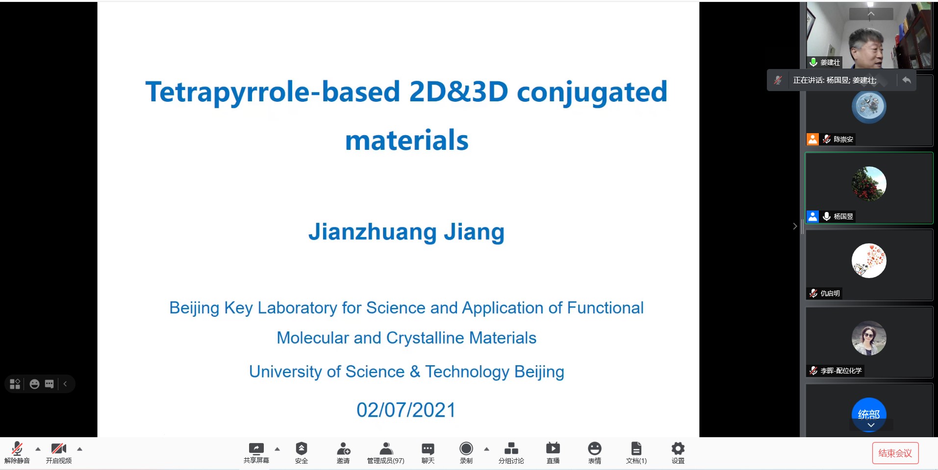 应北京理工大学化学与化工学院邀请,北京科技大学姜建壮教授于2021年7月2日9:20做客北理工“百家大讲堂”,为我院广大师生带来题为“Tetrapyrrole-based 2D&3D conjugated materials”的精彩学术报告。本次报告在腾讯会议平台线上进行,由杨国昱老师主持,近百名化院师生参加了报告。