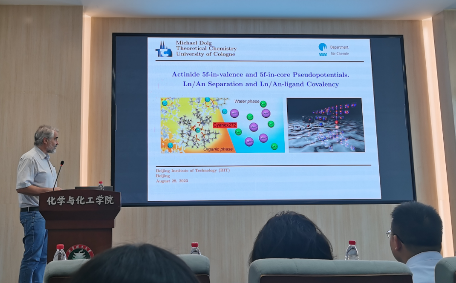 2023年8月28日,德国科隆大学理论化学研究所的Franz Michael Dolg教授和曹晓燕博士应邀访问化学与化工学院。上午10点开始,Dolg教授在良乡校区生态楼118会议室,做了题为“Actinide 5f-in-valence and 5f-in-core pseudopotentials. Ln/An separation and Ln/An-ligand covalency”的学术报告。本次报告是北京理工大学“21世纪学科前沿”系列学术讲座之一。化学与化工学院近40名师生参加了该次报告会。
