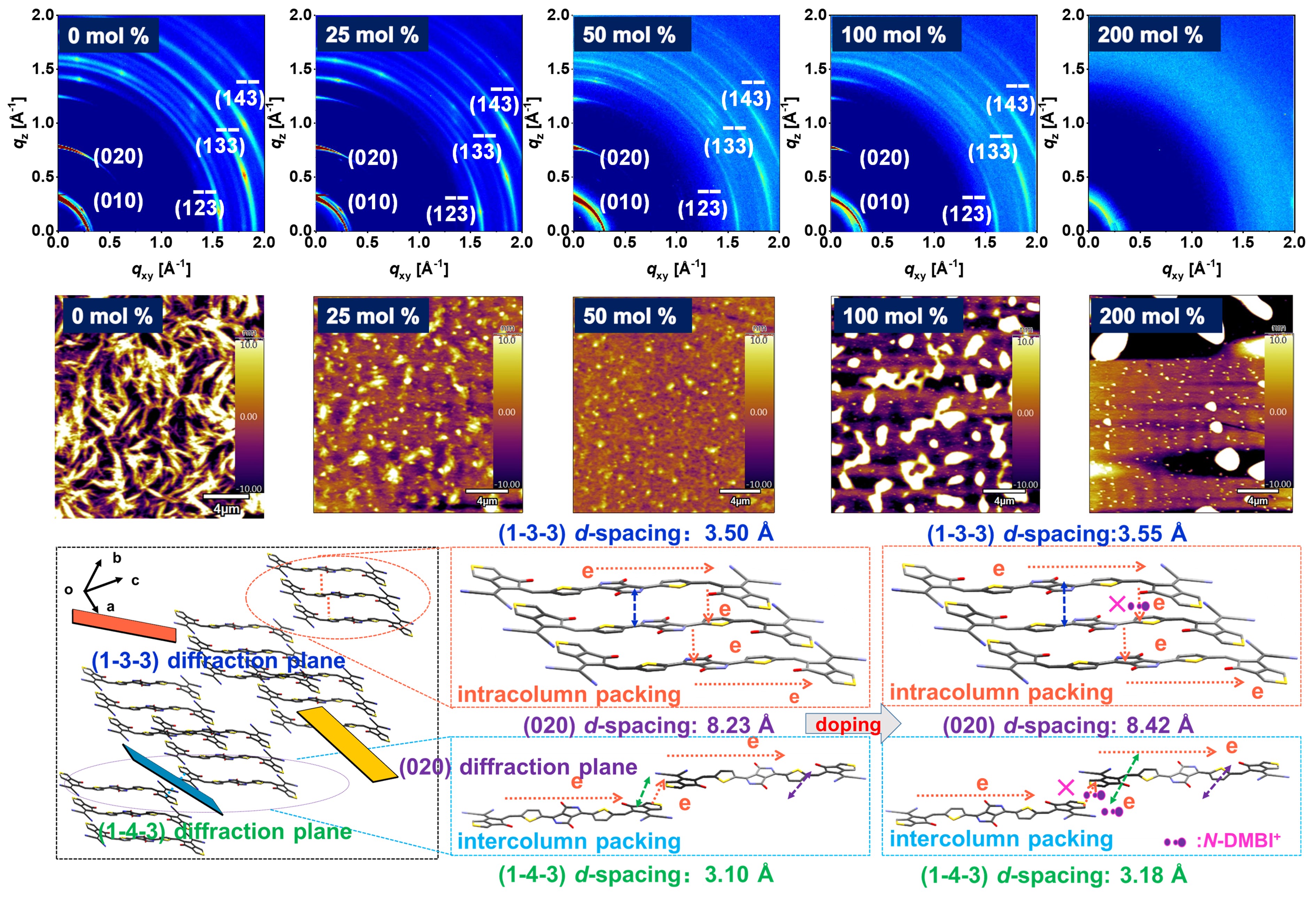 图3. 掺杂剂加入前后薄膜的GIXD和AFM变化情况;(1-3-3), (020), 和 (1-4-3) 衍射面间距随掺杂的变化情况