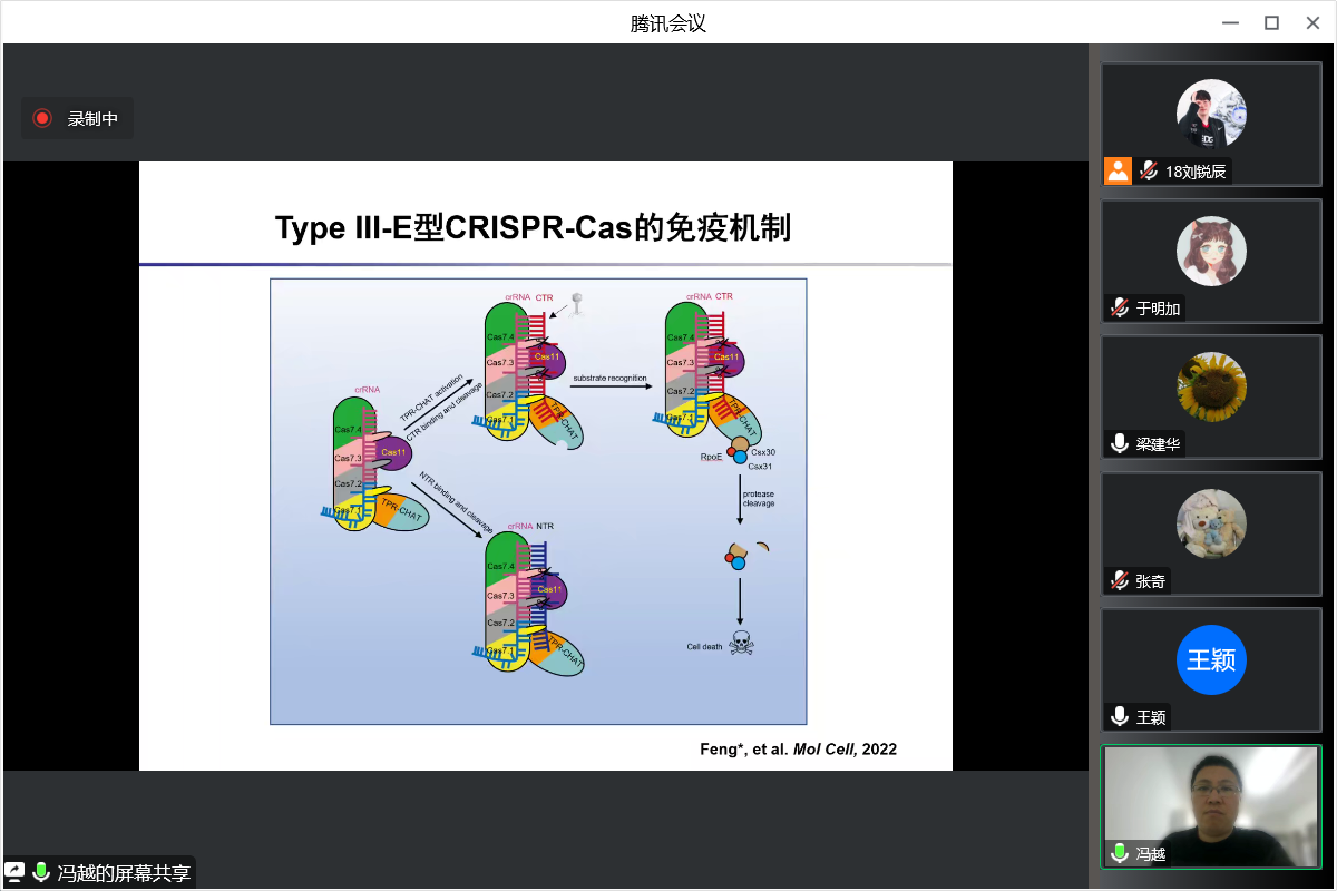 冯越教授深入介绍了细菌CRISPR-Cas免疫系统及噬菌体Anti-CRISPR蛋白的作用机制的研究进展。首先,冯越教授从原核生物防御性免疫系统出发,介绍了大多数原核生物的免疫能力及其功能,CRISPR-Cas系统的工作机制,I-F型CRISPR-Cas系统效应蛋白的工作原理以及Anti-CRISPR(Acr)蛋白的拮抗作用。阐述了AcrⅠF14诱导Csy与dsDNASP和dsDNANS形成三元复合物的实验设计以及结果。冯越教授首先介绍了第一部分:Ⅰ型免疫机制,包括AcrⅠF14在抑制CRISPR-Cas系统中的双重作用、AcrⅠF24在抑制CRISPR-Cas系统中的三重作用和AcrⅠF23抑制Cas2/3的核酸酶活性。着重的介绍了AcrⅠF5抑制Cys-dsDNA对Cas2/3招募的机制,AcrⅠF5与Acr1F3的共同作用,AcrⅠF11的NAD结合机制和催化机制以及AcrⅠF4结合Csy从而抑制Cas2/3的招募。随后冯越教授介绍第二部分Ⅲ型免疫机制,包括Ⅲ-E型CRISPR-Cas系统的简介,gRAMP-crRNA特异性切割target RNA,gRAMP-crRNA与TPR-CHAT形成稳定复合物Craspase,CTR结合激活Craspase对Csx30的蛋白酶活性。着重介绍了Csx30的切割引发有RpoE和Csx31参与的顿挫感染,Csx30切割引发的毒性的来源。最后冯越教授总结了AcrⅠF蛋白抑制CRISPR-Cas系统的机制以及TypeⅢ-E型CRISPR-Cas的免疫机制。