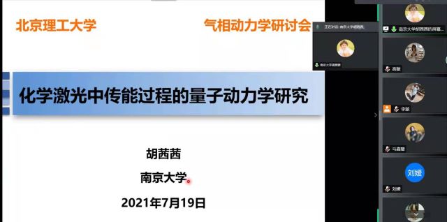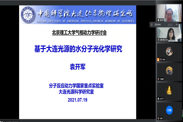 应北京理工大学化学与化工学院马嘉璧副教授邀请,中科院大连化物所袁开军研究员、南开大学张新星研究员、南京大学胡茜茜副教授、重庆大学勾茜教授于2021年7月19日上午8:30在腾讯会议线上分别作了题为“基于大连光源的水分子光化学研究” 、“气液界面化学动力学” 、“化学激光中传能过程的量子动力学研究” 、 “Rethinking π Interactions: Rotational stories”的精彩学术报告。报告由马嘉璧副教授主持,谢静教授及几十名同学参加了此次报告会。